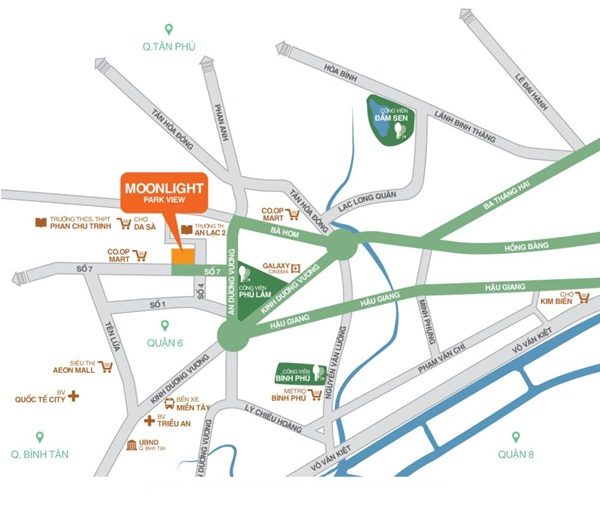 Khu căn hộ Moonlight Park View được chủ đầu tư cho xây dựng ngay tại góc đường số 4 và số 7 của quận Bình Tân. Nơi có hướng view tuyệt đẹp nhìn ra công viên Phú Lâm xanh mát, cùng với đó là hệ thống giao thông vô cùng thuận tiện để cư dân có thể dễ dàng di chuyển đến khu vực trung tâm quận lớn của thành phố một cách nhanh chóng, dễ dàng.